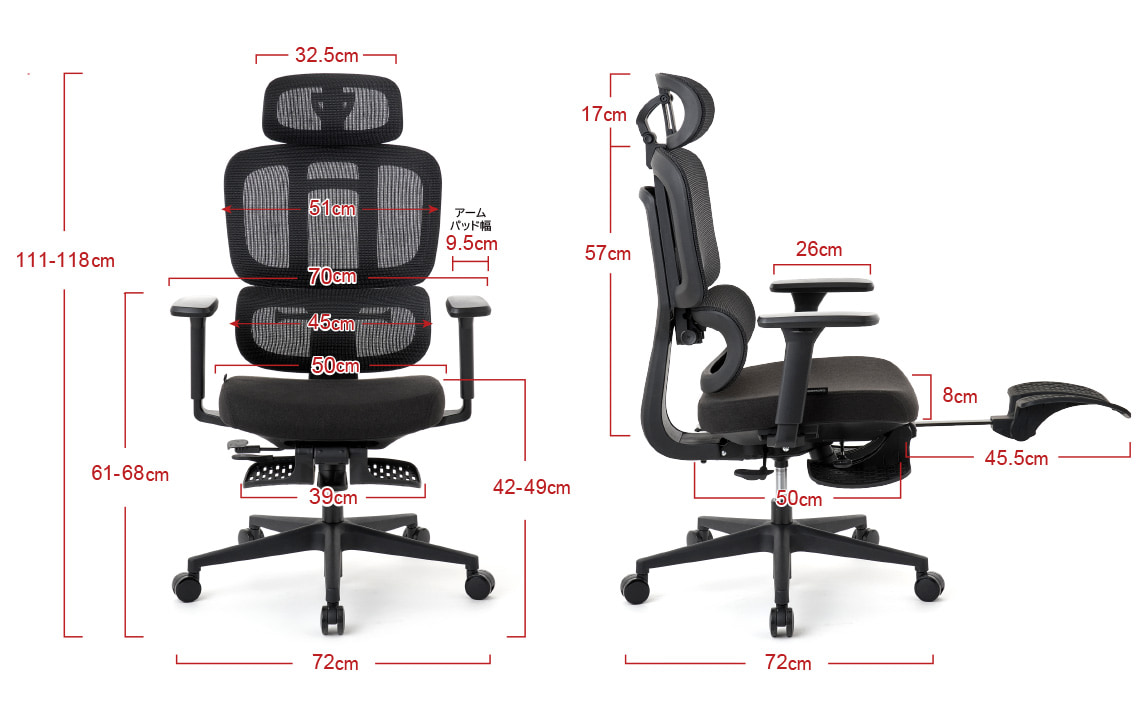 | サイズ | 幅72cmx奥行72cm(フットレスト含む115cm)x高さ111~118cm(座面高:42~49cm) |