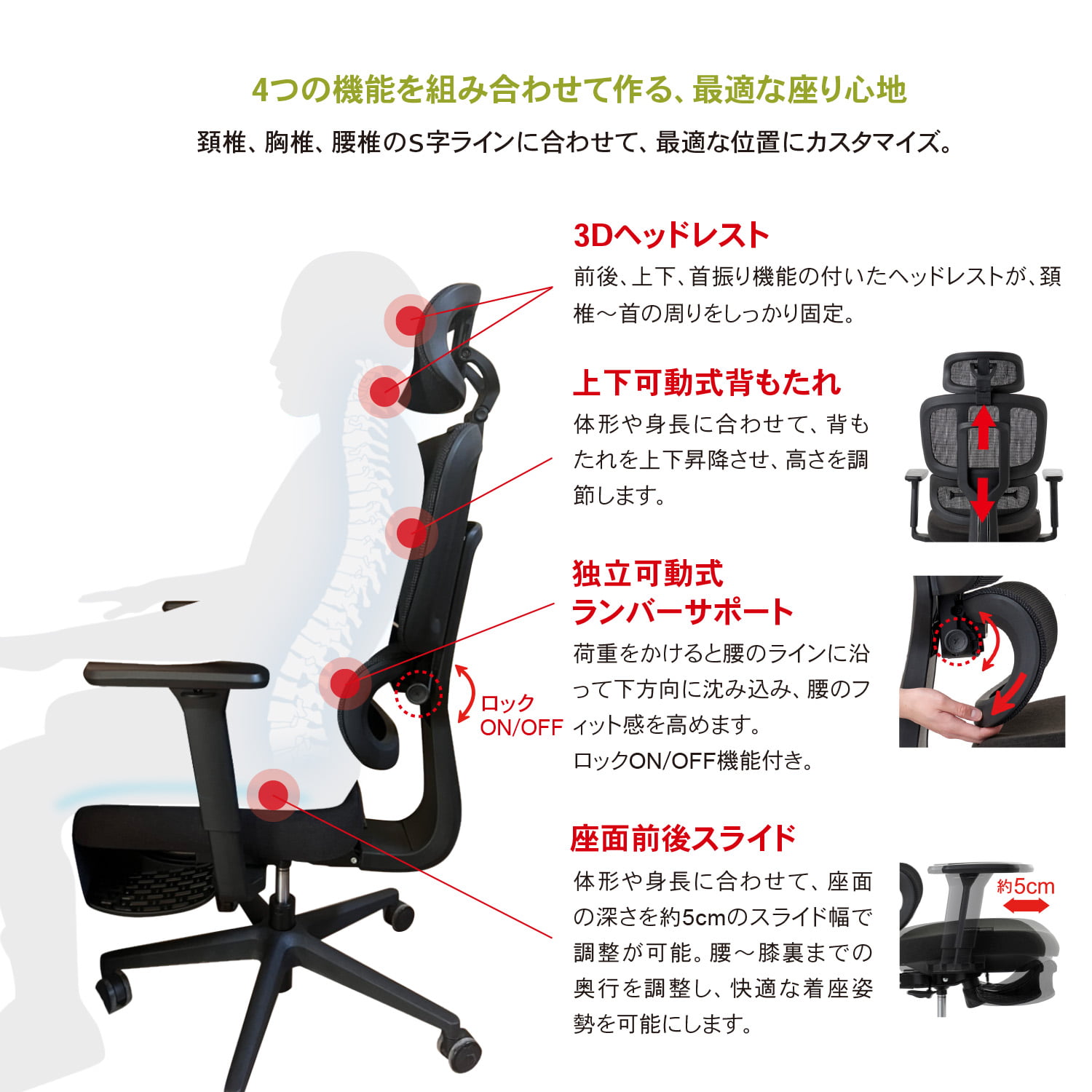 背もたれ上下昇降背もたれを上下に調節ができる機能です。背中や腰のあたり位置を、昇降幅約6cmの範囲で調整できます。