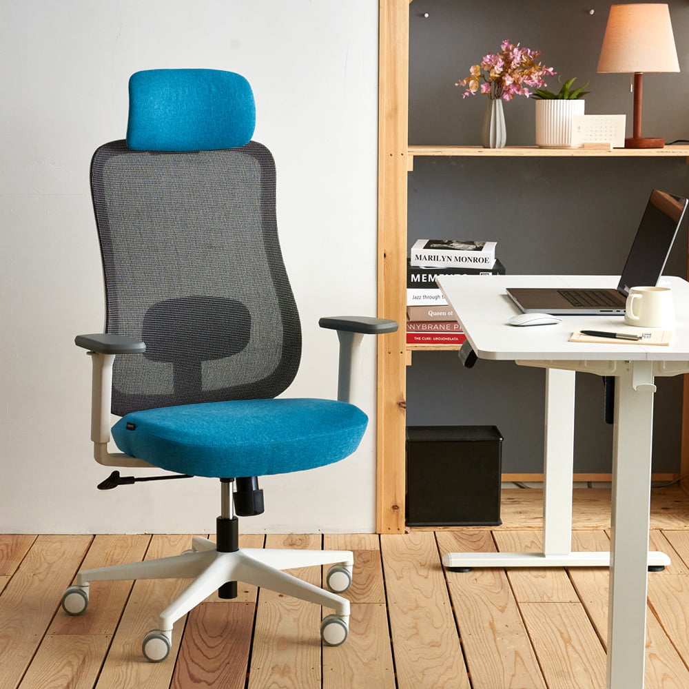 シンプルな丸みのある優しいデザインに彩り豊かなカラーファブリックを組み合わせた北欧モダンスタイルのワークチェア。