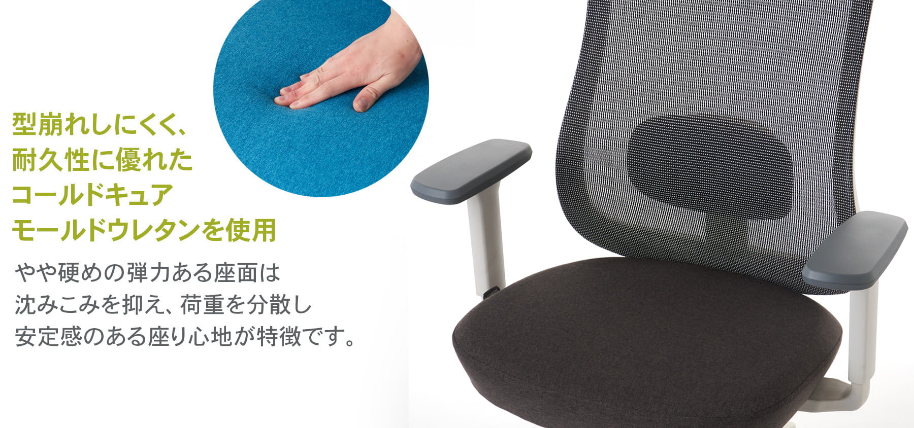 座面には、程よく弾力があり型崩れしにくく耐久性に優れたコールドキュアモールドウレタンを使用。