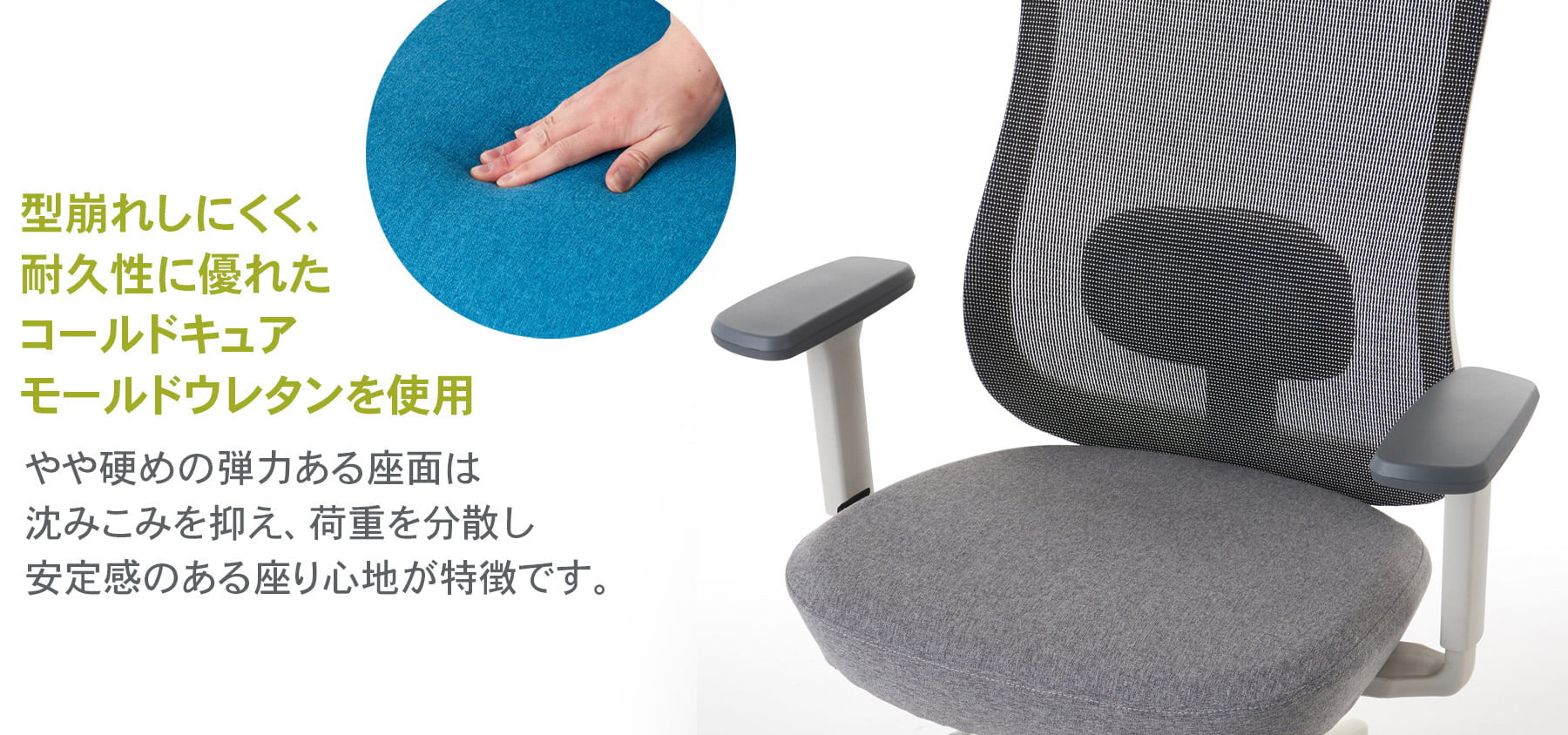 座面には、程よく弾力があり型崩れしにくく耐久性に優れたコールドキュアモールドウレタンを使用。