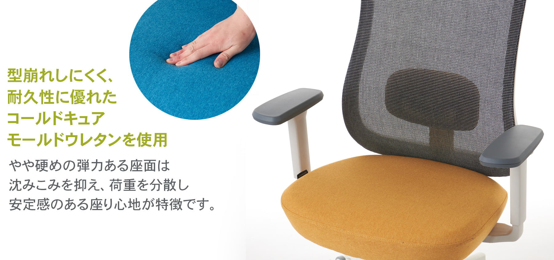 座面には、程よく弾力があり型崩れしにくく耐久性に優れたコールドキュアモールドウレタンを使用。