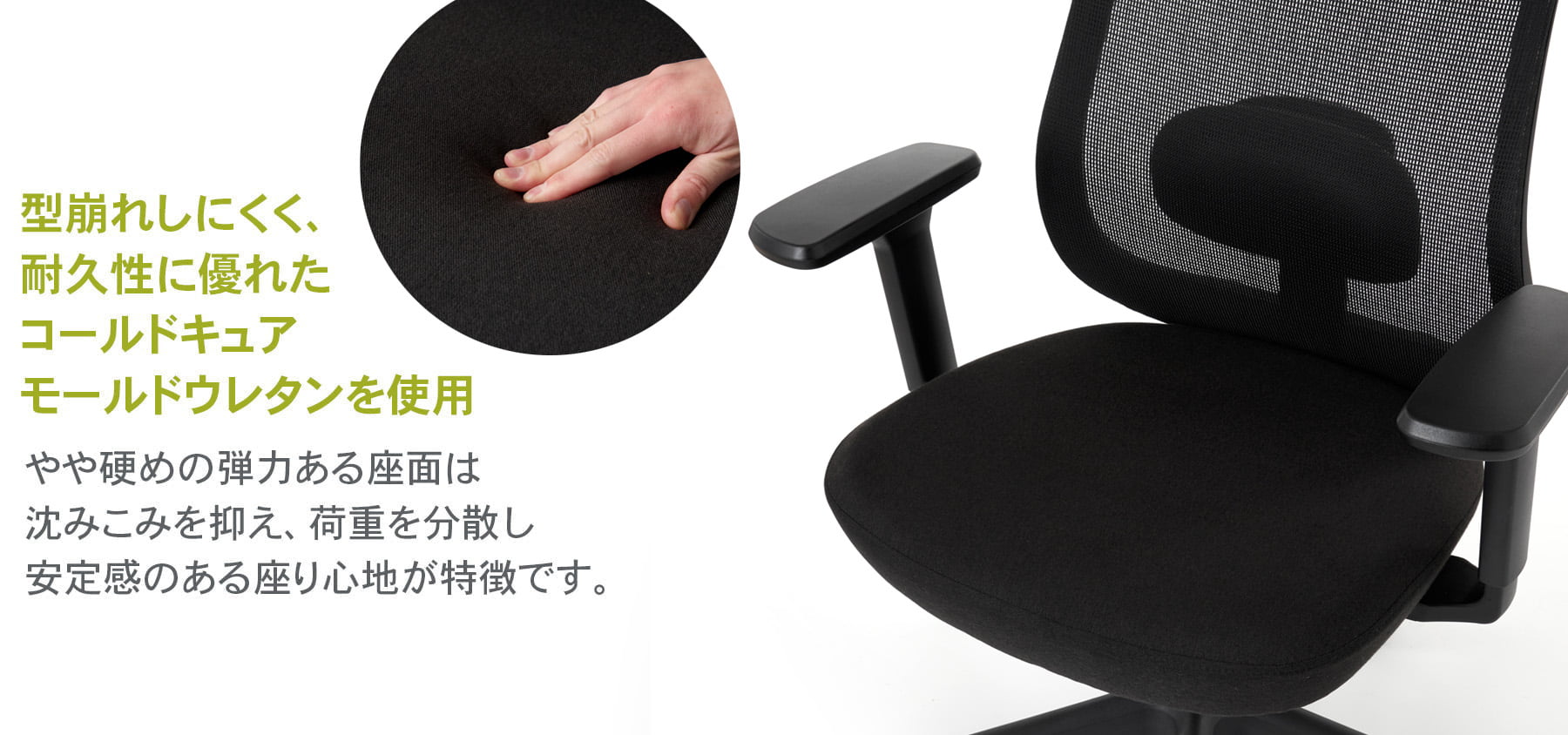 座面には、程よく弾力があり型崩れしにくく耐久性に優れたコールドキュアモールドウレタンを使用。