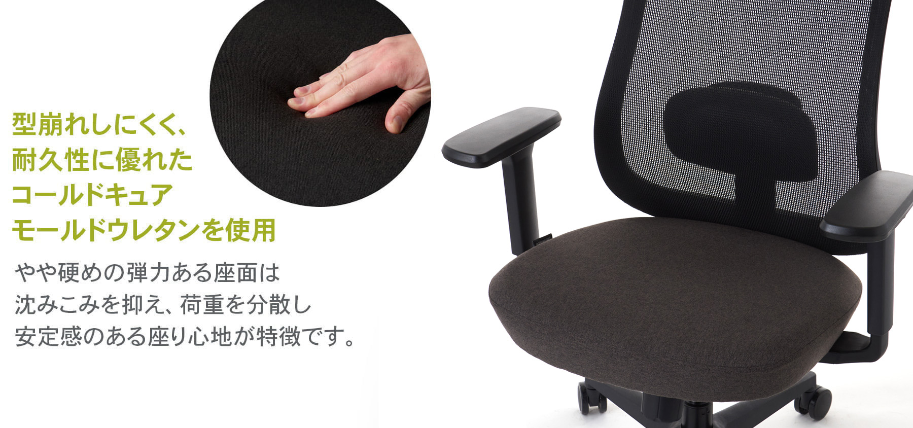 座面には、程よく弾力があり型崩れしにくく耐久性に優れたコールドキュアモールドウレタンを使用。