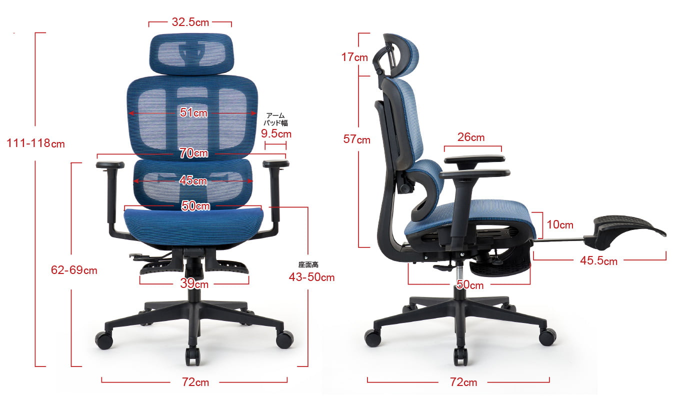 | サイズ | 幅72cmx奥行72cm(フットレスト含む114cm)x高さ111~118cm(座面高:43~50cm) |