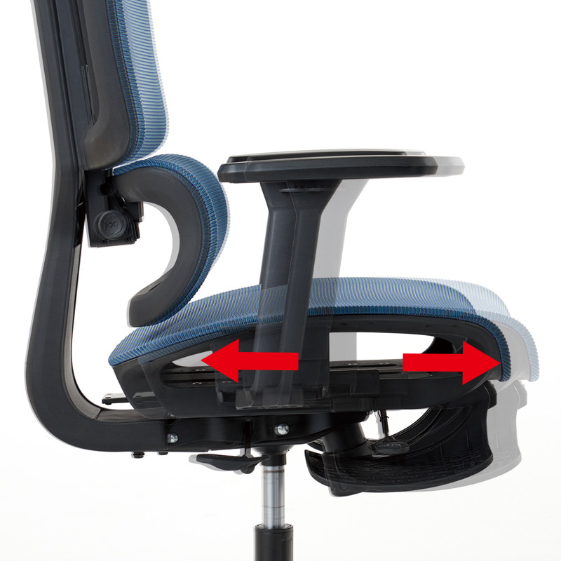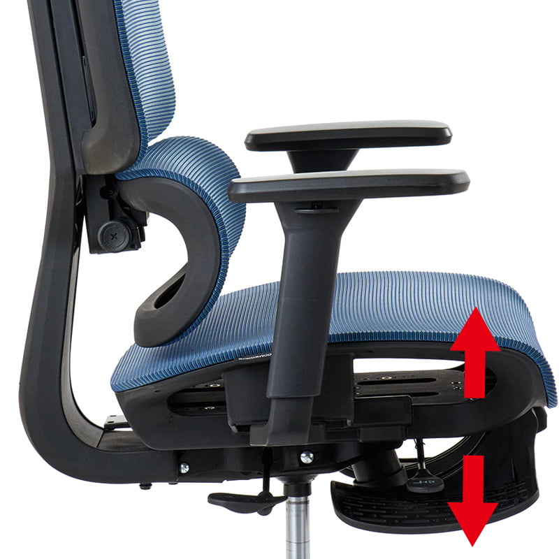 (奥行き調整)右側前方のレバーを引き上げ、座面を前後にスライドさせ、奥行きを調整する機能です。前後スライド幅は約5センチです。