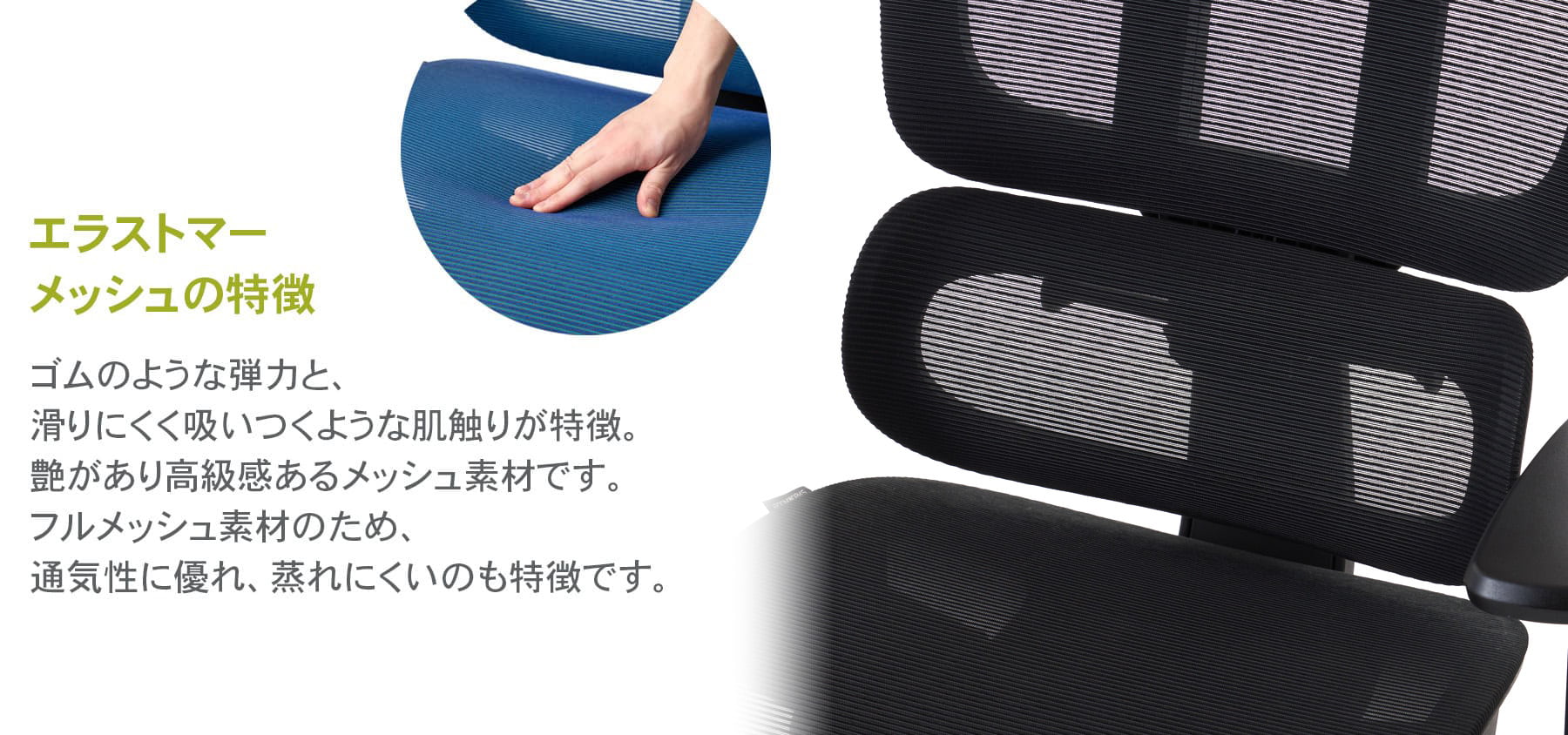 蒸れないフルメッシュシート背もたれ、座面にエラストマーメッシュを使用したフルメッシュタイプのチェアです。年中蒸れない通気性の良さが特徴です。 エラストマーメッシュゴムのような弾力と滑りにくく吸い付くような肌触りが特徴の高級感のある素材です。  |